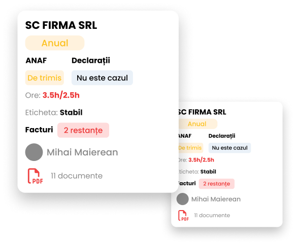 Află mai multeAnalizăm situația fiscală a afacerii tale, identificăm deduceri și oferim consultanță pentru structura optimă. Astfel reduci costurile și eviți surprizele neplăcute.